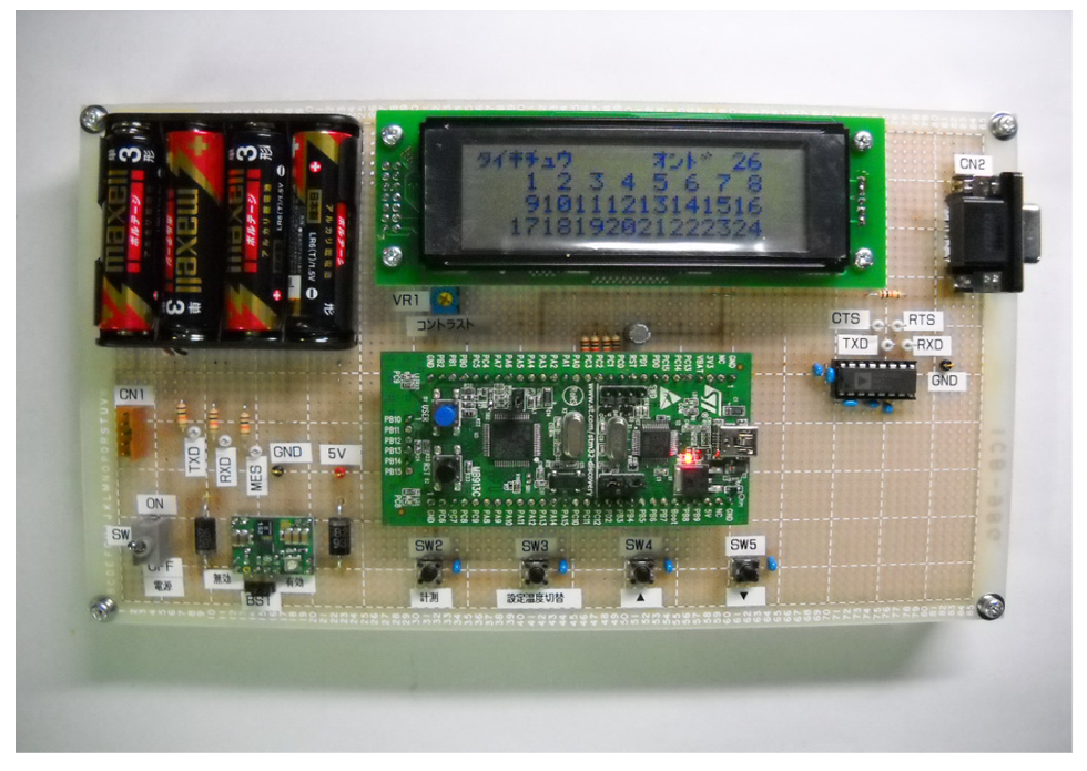 | 仕様内容 | 赤外線放射温度計にて計測した64エリアの中から、設定温度以上のエリアの番号をLCDに反転表示させる。 また、64エリアの計測温度をシリアル通信にてPCへ送信。 |