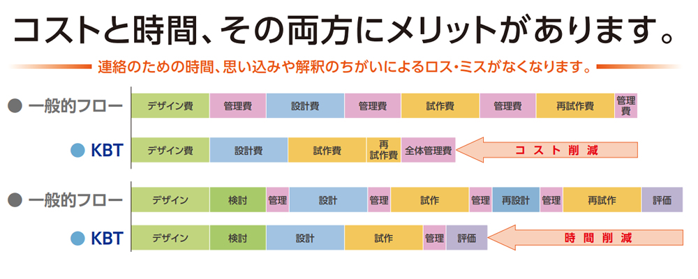 カスタマー側のご担当者には、結構な負荷がかかっています。デザイナー、 設計者、各製造プロセスの担当者ごとに同じような話を繰り返す必要が あり、コスト管理も各プロセスごとに行わなければなりません。 このような悩みをケイ・ビーテクニカは一気に解消します。最も重要な打ち 合わせは初期段階で、あとは当社からの報告をお待ちいただき、内容を 検討、その結果を連絡する繰り返しでプロジェクトが進行します。