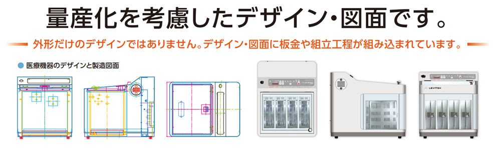 自由な発想を妨げるとの意見もありますが、プロダクト・ デザインの分野では初期デザインの段階で後々の製造 工程について考慮されていることが理想です。 それは、材料の性質、耐久性、組立時のクリアランス、配線、 動作範囲、放熱などの要素がデザインそのものに大きく 関わってくるからです。 一般的なフローとしては、まずデザインを選定します。そこ から試作を進める途中で、放熱スペースやクリアランスなど 製造上の理由から寸法・形状が少しずつ変更されることも よくあることでしょう。そして、やっと試作品ができたときには 何かがちがう̶̶というのもよくある話です。 これは、デザイナーが製造工程を深く理解していないことに 起因する問題です。 ケイ・ビー・テクニカでは製造経験のあるデザイナーが発案 するため、量産化を考慮したデザイン・図面の制作が可能 です。それは、結果的に多くのメリットをカスタマーへと もたらします。