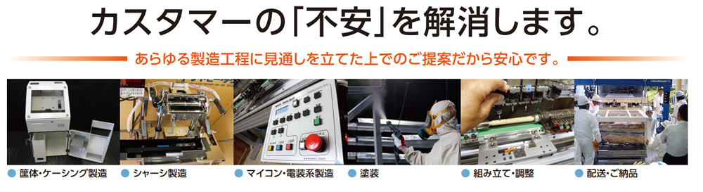 新しい試みを含む新製品開発であったり、量産タイプでは ないカスタム製造の場合、先の見通しがききにくく不安に なる場合もあると思います。 ケイ・ビー・テクニカのスタッフは全員が製造業の経験を もつベテランで、製造のポイントを把握しています。自らの 手を動かして「ものづくり」を行った経験、そしてプロフェッ ショナルどうしのネットワークが、新製品の試作から小ロット 量産まで不安なくカバーします。